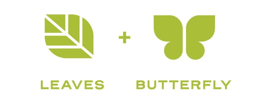 From the beginning, I liked the idea of incorporating the shape of a leaf into the logo somehow. I experimented with a variety of options, but my favorites featured leaves in one way or another. I kept coming back to the shape of butterfly wings, since they were similar to the natural shape of leaves.